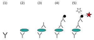 A "sandwich" ELISA is used to detect sample antigen,[30] the steps are: