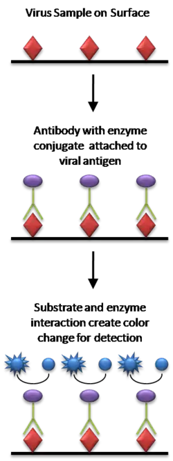 Performing an ELISA involves at least one antibody with specificity for a particular antigen. The sample with an unknown amount of antigen is immobilized on a solid support either non-specifically or specifically . After the antigen is immobilized, the detection antibody is added, forming a complex with the antigen. The detection antibody can be covalently linked to an enzyme or can itself be detected by a secondary antibody that is linked to an enzyme through bioconjugation. Between each step, the plate is typically washed with a mild detergent solution to remove any proteins or antibodies that are non-specifically bound. After the final wash step, the plate is developed by adding an enzymatic substrate to produce a visible signal, which indicates the quantity of antigen in the sample.[1][5][8]