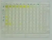 ![]() An ELISA being developed with TMB substrate for horseradish peroxidase-linked secondary antibody | |
