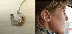 ![]() Examples of in-ear EEG mounts. On the left is seen a single earplug (right ear), on the right is seen a right earplug in ear | |