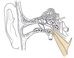 The pressure difference between the middle ear and the outside, if not released, can result in a burst eardrum.[10] This damages hearing,[11] and if this occurs underwater, cold water in the middle ear chills the inner ear, causing vertigo.[12] The pressure difference can also cause damage to other body air spaces, such as the paranasal sinuses.[13] This can also be caused by damaged sinus ducts.
