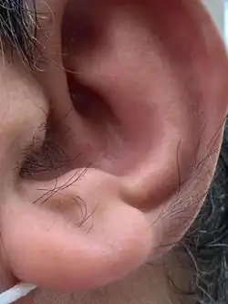 Ear hair is the terminal hair arising from folliculary cartilage inside the external auditory meatus in humans.[1] In its broader sense, ear hair may also include the fine vellus hair covering much of the ear, particularly at the prominent parts of the anterior ear, or even the abnormal hair growth as seen in hypertrichosis and hirsutism. Medical research on the function of ear hair is currently very scarce.
