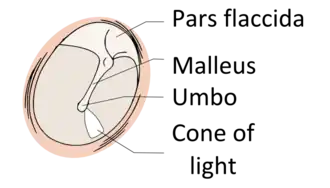 The manubrium (Latin for "handle") of the malleus is firmly attached to the medial surface of the membrane as far as its center, drawing it toward the tympanic cavity. The lateral surface of the membrane is thus concave. The most depressed aspect of this concavity is termed the umbo (Latin for "shield boss").[7]