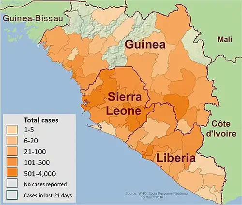 In Liberia, the disease was reported in four counties by mid-April 2014 and cases in Liberia's capital Monrovia were reported in mid-June.[48] The outbreak then spread to Sierra Leone and progressed rapidly. By 17 July, the total number of suspected cases in the country stood at 442, surpassing those in Guinea and Liberia.[49] By 20 July, additional cases of the disease had been reported by the media in the Bo District, while the first case in Freetown, Sierra Leone's capital, was reported in late July.[50][51]