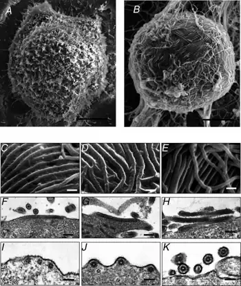 {{cite journal}}: CS1 maint: unflagged free DOI (link) - ↑ 24.0 24.1 24.2 Saeed, Mohammad F.; Kolokoltsov, Andrey A.; Albrecht, Thomas; Davey, Robert A. (2010-09-16). "Cellular entry of ebola virus involves uptake by a macropinocytosis-like mechanism and subsequent trafficking through early and late endosomes". PLOS Pathogens. 6 (9): e1001110. doi:10.1371/journal.ppat.1001110. ISSN 1553-7374. PMC 2940741. PMID 20862315.
