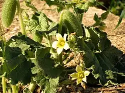 Ecballium elaterium is a herbaceous perennial plant with a tuberous root, usually traling on the ground but sometimes shrubby, with bristly stems. The leaves are lobed, greyish-green, and rough-surfaced and bristly-hairy. The flowers have a five-lobed yellow corolla, 2–5 cm (0.79–1.97 in) diameter, maturing into an oval green or blue-green fruit about 5 cm (2.0 in) long, resembling a tiny but hairy cucumber.[4][6][7]