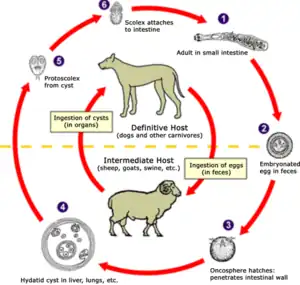 Also like many other parasite infections, the course of Echinococcus infection is complex. The worm has a life cycle that requires definitive hosts and intermediate hosts. Definitive hosts are normally carnivores such as dogs, while intermediate hosts are usually herbivores such as sheep and cattle. Humans function as accidental hosts, because they are usually a dead end for the parasitic infection cycle.