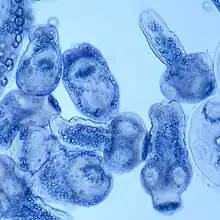 From the embryo released from an egg develops a hydatid cyst, which grows to about 5–10 cm within the first year and is able to survive within organs for years.[16] Cysts sometimes grow to be so large that by the end of several years or even decades, they can contain several liters of fluid. Once a cyst has reached a diameter of 1 cm, its wall differentiates into a thick outer, non-cellular membrane, which covers the thin germinal epithelium. From this epithelium, cells begin to grow within the cyst. These cells then become vacuolated, and are known as brood capsules, which are the parts of the parasite from which protoscolices bud. Often, daughter cysts also form within cysts.[15]