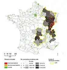 Location of people, controls, and areas in France where persons are at risk for alveolar echinococcosis. See legend below the image.