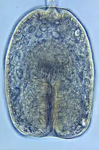 Echinococcus granulosus, also called the hydatid worm, hyper tape-worm or dog tapeworm, is a cyclophyllid cestode that dwells in the small intestine of canids as an adult, but which has important intermediate hosts such as livestock and humans, where it causes cystic echinococcosis, also known as hydatid disease. The adult tapeworm ranges in length from 3 mm to 6 mm and has three proglottids ("segments") when intact—an immature proglottid, mature proglottid and a gravid proglottid.[1] The average number of eggs per gravid proglottid is 823. Like all cyclophyllideans, E. granulosus has four suckers on its scolex ("head"), and E. granulosus also has a rostellum with hooks. Several strains of E. granulosus have been identified, and all but two are noted to be infective in humans.[2]