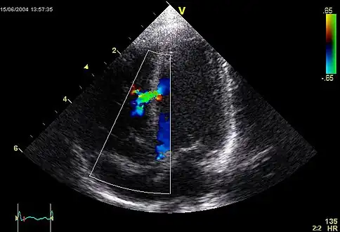 An abnormal echocardiogram: Image shows a midmuscular ventricular septal defect. The trace in the lower left shows the cardiac cycle and the red mark the time in the cardiac cycle when the image was captured. Colors are used to represent the velocity and direction of blood flow.