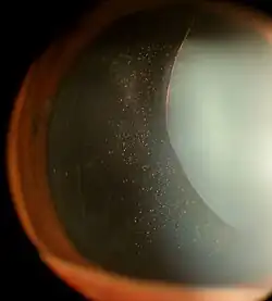 Lens subluxation is also seen in dogs and is characterized by a partial displacement of the lens. It can be recognized by trembling of the iris (iridodonesis) or lens (phacodonesis) and the presence of an aphakic crescent (an area of the pupil where the lens is absent).[4] Other signs of lens subluxation include mild conjunctival redness, vitreous humour degeneration, prolapse of the vitreous into the anterior chamber, and an increase or decrease of anterior chamber depth.[5] Removal of the lens before it completely luxates into the anterior chamber may prevent secondary glaucoma.[2] Extreme degree of luxation of lens is called "lenticele" in which lens comes out of the eyeball and becomes trapped under the Tenon's capsule or conjunctiva.[6] A nonsurgical alternative treatment involves the use of a miotic to constrict the pupil and prevent the lens from luxating into the anterior chamber.[7]