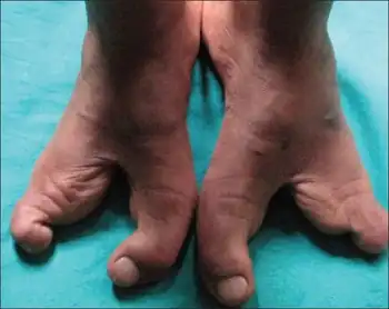 Ectrodactyly involves the deficiency or absence of one or more central digits of the hand or foot and is also known as split hand–split foot malformation (SHFM).[9] The hands and feet of people with ectrodactyly are often described as "claw-like" and may include only the thumb and one finger (usually either the little finger, ring finger, or a syndactyly of the two) with similar abnormalities of the feet.[6] It is sometimes referred to as "lobster claw" syndrome.[1] Archived 2021-02-13 at the Wayback Machine