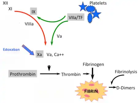 - ↑ 5.0 5.1 5.2 5.3 5.4 5.5 5.6 5.7 5.8 Parasrampuria DA, Truitt KE (June 2016). "Pharmacokinetics and Pharmacodynamics of Edoxaban, a Non-Vitamin K Antagonist Oral Anticoagulant that Inhibits Clotting FactorXa". Clinical Pharmacokinetics. 55 (6): 641–55. doi:10.1007/s40262-015-0342-7. PMC 4875962. PMID 26620048.