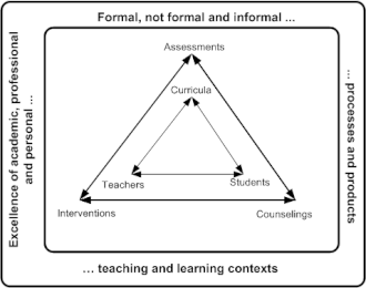 Psychology is a well-developed discipline that allows different specializations, which include; clinical and health psychology, work and organizational psychology, educational psychology, etc.[1][2][3][4][5][6][7] What differentiates an educational psychologist from other psychologists or specialists is constituted by an academic triangle whose vertexes are represented by three categories: teachers, students, and curricula (see diagram). The use of plural in these three cases assumes two meanings; the traditional or official one and other more general derived from our information and knowledge society. The plural also indicates that nowadays, we can no longer consider the average student or teacher, or a closed curriculum, but the enormous variety found in our students, teachers, and curricula. The triangle vertexes are connected by two-directional arrows, allowing four-fold typologies instead of the traditional two-way relationships (e.g., teacher-student). In this way, we can find, in different educational contexts, groups of good teachers and students (excellent teaching/learning processes and products), groups of good teachers but bad students, and groups of bad teachers and good students, producing in both cases lower levels of academic achievements. In addition, we can find groups of bad teachers and bad students (school failure). This specific work of an educational psychologist takes place in different contexts: micro-, meso- and macro-systems.[8] Microsystems refer to family contexts, where atmosphere, hidden curriculum, and expectations and behaviors of all family members determine, to a large extent, the educational development of each student. The term mesosystem refers to all variety of contexts found in educational institutions, knowing that different variables such as geographical location, institution marketing or type of teachers and students, etc., can influence the academic results of students. Macrosystem has a much more general and global nature, leading us, for example, to consider the influence that the different societies or countries have on educational final products. One illustrative example of this level can be the analyses carried out on data gathered by the PISA reports. This approach would be the essence of educational psychology versus school psychology for many of U.S. educational researchers and for Division 15 of APA.