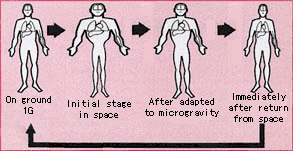 Short-term exposure to microgravity causes space adaptation syndrome, self-limiting nausea caused by derangement of the vestibular system. Long-term exposure causes multiple health problems, one of the most significant being loss of bone and muscle mass. Over time these deconditioning effects can impair astronauts' performance, increase their risk of injury, reduce their aerobic capacity, and slow down their cardiovascular system.[58] As the human body consists mostly of fluids, gravity tends to force them into the lower half of the body, and our bodies have many systems to balance this situation. When released from the pull of gravity, these systems continue to work, causing a general redistribution of fluids into the upper half of the body. This is the cause of the round-faced 'puffiness' seen in astronauts,[51][59] and may contribute to observations of altered speech motor control in astronauts.[60] Redistributing fluids around the body itself causes balance disorders, distorted vision, and a loss of taste and smell.
