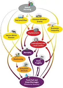 Climate change may increase the risk of violent conflict, which can lead to injuries, such as battle injuries, and death. Conflict can result from the increased propensity towards violence after people become more irritable due to excessive heat.[63] There can also be follow-on effects on health from resource scarcity or human migrations that climate change can cause or aggravate in already conflict prone areas.[64][65]