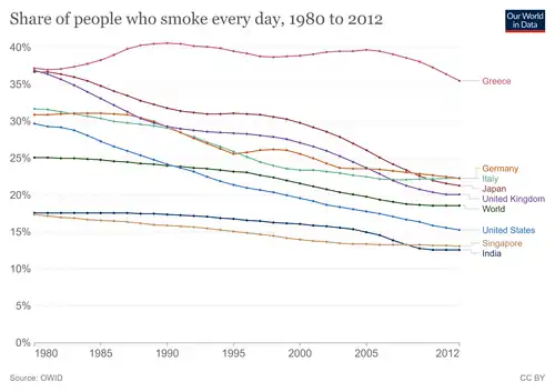 81. 81.0 81.1 Singh, Tushar; Arrazola, René A.; Corey, Catherine G.; Husten, Corinne G.; Neff, Linda J.; Homa, David M.; King, Brian A. (2016). "Tobacco Use Among Middle and High School Students — United States, 2011–2015". MMWR. Morbidity and Mortality Weekly Report. 65 (14): 361–367. doi:10.15585/mmwr.mm6514a1. ISSN 0149-2195. PMID 27077789.