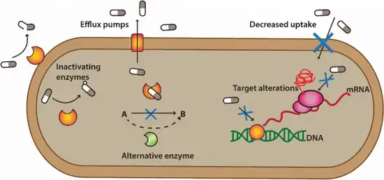 - ↑ Li XZ, Plésiat P, Nikaido H (April 2015). "The challenge of efflux-mediated antibiotic resistance in Gram-negative bacteria". Clinical Microbiology Reviews. 28 (2): 337–418. doi:10.1128/CMR.00117-14. PMC 4402952. PMID 25788514.