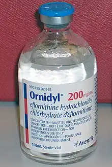 Eflornithine, sold under the brand name Vaniqa among others, is a medication used to treat African trypanosomiasis (sleeping sickness) and excessive hair growth on the face in women.[3][4] Specifically it is used for the 2nd stage of sleeping sickness caused by T. b. gambiense and may be used with nifurtimox.[3][5] It is used by injection or applied to the skin.[3][4]