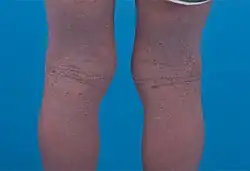 Young children may exhibit dermatitis/eczema on the face, scalp, and other parts of the body; in older children, knees and elbows are more commonly affected. Children with dermatitis are at a greater than expected risk of also exhibiting asthma and allergic rhinitis.[22]