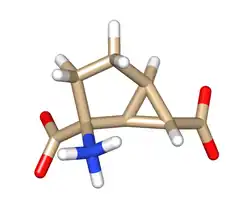 - ↑ Monn JA, Valli MJ, Massey SM, Wright RA, Salhoff CR, Johnson BG, Howe T, Alt CA, Rhodes GA, Robey RL, Griffey KR, Tizzano JP, Kallman MJ, Helton DR, Schoepp DD (February 1997). "Design, synthesis, and pharmacological characterization of (+)-2-aminobicyclo[3.1.0]hexane-2,6-dicarboxylic acid (LY354740): a potent, selective, and orally active group 2 metabotropic glutamate receptor agonist possessing anticonvulsant and anxiolytic properties". J. Med. Chem. 40 (4): 528–37. doi:10.1021/jm9606756. PMID 9046344.