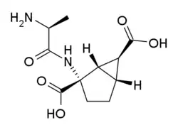 - ↑ Bueno AB, Collado I, de Dios A, Domínguez C, Martín JA, Martín LM, Martínez-Grau MA, Montero C, Pedregal C, Catlow J, Coffey DS, Clay MP, Dantzig AH, Lindstrom T, Monn JA, Jiang H, Schoepp DD, Stratford RE, Tabas LB, Tizzano JP, Wright RA, Herin MF (August 2005). "Dipeptides as effective prodrugs of the unnatural amino acid (+)-2-aminobicyclo[3.1.0]hexane-2,6-dicarboxylic acid (LY354740), a selective group II metabotropic glutamate receptor agonist". J. Med. Chem. 48 (16): 5305–20. doi:10.1021/jm050235r. PMID 16078848.