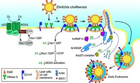 E. chaffeensis causes human monocytic ehrlichiosis and is known to infect monocytes.[1] It has also been known to infect other cell types such as lymphocytes, atypical lymphocytes, myelocytes, and neutrophils, but monocytes appear to best harbor the infection.[1]