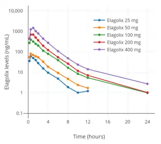 Elagolix is metabolized in the liver, with the major pathway being by CYP3A and minor pathways including by CYP2D6, CYP2C8, and UDP-glucuronosyltransferases.[1] The terminal half-life of elagolix is typically about 4 to 6 hours.[1][26] A study found that its half-life was 2.4 to 6.3 hours with a single dose and was 2.2 to 10.8 hours with continuous administration.[5][6] The oral clearance of elagolix is 123 L/hour at 150 mg once per day and 144 L/hour at 200 mg twice per day.[1] The major pathway of elimination of elagolix is hepatic metabolism.[1] Elagolix is taken up from the circulation into the liver by the hepatic OATP1B1 carrier.[1] In people with two reduced function alleles of the gene that encodes OATP1B1 (SLCO1B1 521T>C; SLCO1B1 521 C/C genotype), plasma levels of elagolix have been found to be increased by 78% relative to in people with normal OATP1B1 function (SLCO1B1 521T/T genotype).[1] The frequency of this reduced function OATP1B1 genotype is generally less than 5% in most racial and ethnic groups.[1] Elagolix is excreted less than 3% in urine and 90% in feces.[1]