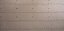 Electrical alternans is an electrocardiographic phenomenon of alternation of QRS complex amplitude or axis between beats and a possible wandering base-line. It can be seen in cardiac tamponade and severe pericardial effusion and is thought to be related to changes in the ventricular electrical axis due to fluid in the pericardium, as the heart essentially wobbles in the fluid filled pericardial sac.[1] It can also be found in other conditions, such as bidirectional ventricular tachycardia from digoxin toxicity [2] and atrioventricular tachycardia. [3]