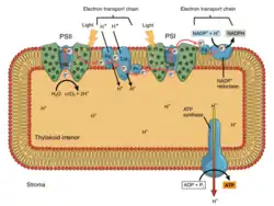 In oxidative phosphorylation, electrons are transferred from an electron donor such as NADH to an acceptor such as O2 through an electron transport chain, releasing energy. In photophosphorylation, the energy of sunlight is used to create a high-energy electron donor which can subsequently reduce oxidized components and couple to ATP synthesis via proton translocation by the electron transport chain.[9]