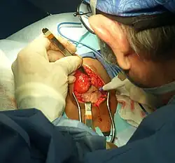 ![]() A surgeon using a monopolar RF electrosurgical instrument to coagulate (and desiccate) tissue in the excision of a lipoma | |