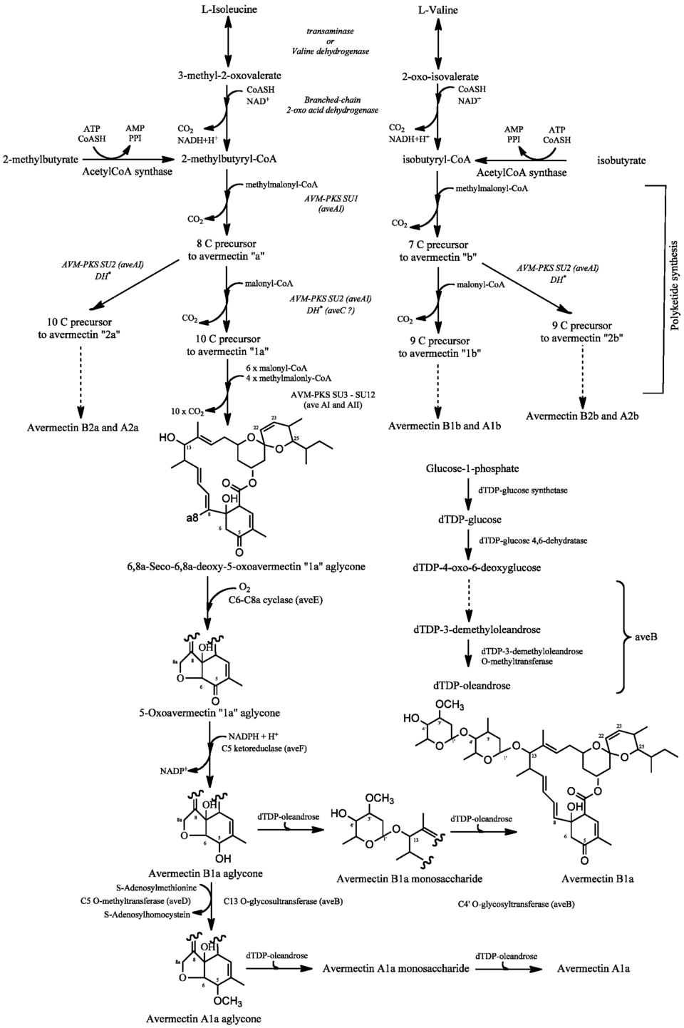 Avermectin biosynthesis is classified into three stages: the formation of the polyketide-derived initial aglycone, modification of the initial aglycone to produce avermectin aglycones, and glycosylation of avermectin aglycones to generate avermectins.[11]