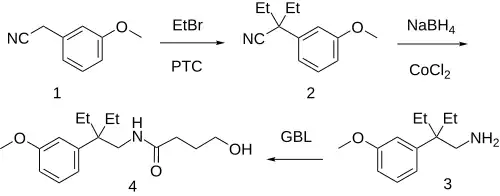 Alkylation of (3-methoxyphenyl)acetonitrile (1) with bromoethane gives 2-ethyl-2-(3-methoxyphenyl)butanenitrile (2). Sodium borohydride is used to reduce the nitrile group to give 2-ethyl-2-(3-methoxyphenyl)butan-1-amine (3). Amide formation via reaction with gamma-butyrolactone (GBL) completes the synthesis of embutramide (4).
