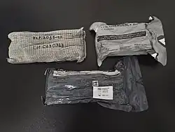 The Emergency Bandage's packaging consists of multiple layers that protect the bandage from becoming damaged and unsterile prior to it being opened; The upper right grey packaging is the newest version of the bandage's outer layer, while the upper left clear, written on wrapper is the bandage's inner layer of packaging. The lower, blue-ish looking bandage is the [old] version of the bandage's first layer of packaging.