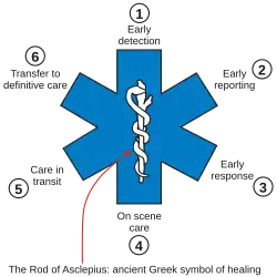 Emergency medical services exists to fulfill the basic principles of first aid, which are to Preserve Life, Prevent Further Injury, and Promote Recovery. This common theme in medicine is demonstrated by the "star of life". The Star of Life shown here, where each of the 'arms' to the star represent one of the six points, are used to represent the six stages of high quality pre-hospital care, which are:[35]