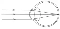 Emmetropia is the state of vision in which a faraway object at infinity is in sharp focus with the ciliary muscle[1] in a relaxed state. That condition of the normal eye is achieved when the refractive power of the cornea and eye lens and the axial length of the eye balance out, which focuses rays exactly on the retina, resulting in perfectly sharp distance vision. A human eye in a state of emmetropia requires no corrective lenses for distance; the vision scores well on a visual acuity test (such as an eye chart test).