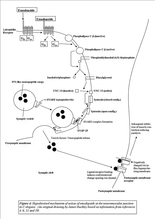 At a molecular level, the net result of the activation of this pathway, is the spontaneous stimulation of inhibitory PF1-like neuropeptide release (this is suspected due to Emodepside's inhibition of acetylcholine-elicited muscle contraction requiring both calcium ions and extracellular potassium ions, similar to the action of PF1/PF2). Although in experiments on synaptosomes, α-LTX triggered non-calcium dependent exocytosis of vesicles containing acetylcholine, glutamate and GABA,[15] both glutamate[6] and GABA[15] have been ruled out as the sole neurotransmitters responsible for emodepside's action) which then acts on the post-synaptic membrane (i.e. the pharyngeal/muscle membrane) of the nematode, having an inhibitory effect thereby either inducing paralysis or inhibiting pharyngeal pumping, both of which ultimately result in the death of the organism.
