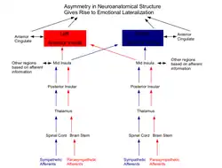 This model provides a neuroanatomical basis for emotional control and processing. The peripheral autonomic nervous system is not symmetrical. Afferent nerves in the parasympathetic and sympathetic systems of the autonomic nervous system differently innervate various organs that maintain homeostasis such as the heart and the face.[4] The asymmetrical representation of the autonomic peripheral nervous system leads to the asymmetrical representation in the brain.[5] The left hemisphere is activated predominantly by homeostatic afferents associated with parasympathetic functions and the right hemisphere is activated predominantly by homeostatic afferents associated with sympathetic functions. The lateralization is extremely apparent in the anterior cingulate cortex (ACC) and anterior insular cortex (AI) associated with higher emotions such as romantic love and motivation correlated with homeostatic functions. The left AI and ACC are more active during feelings of romantic love and maternal attachment. The AI and ACC were activated on both the right and left sides while watching pain being inflicted on a loved one while only the right AI and ACC that is elicited during subjective feelings of pain; this supports the association of right AI in aroused ('sympathetic') feelings and left AI in affiliative ('parasympathetic') feelings.