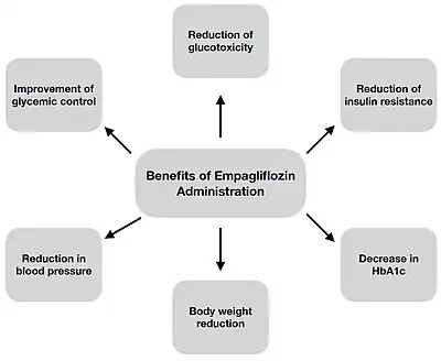 SGLT2 inhibitors, including empagliflozin, appear to reduce the likelihood of hospitalization for heart failure or progression of chronic kidney disease in persons with type 2 diabetes. Empagliflozin may reduce the likelihood of death due to cardiovascular causes in people with type 2 diabetes who have known cardiovascular disease.[24][25][26] One concern regarding the trial on which these claims are based is that the different arms received different amounts of other medications; thus, the reduced risk cannot necessarily be attributed to empaglifozin.[27] In some countries it has also been approved to reduce the risk of death from cardiovascular causes in people with type 2 diabetes and heart disease.[26]