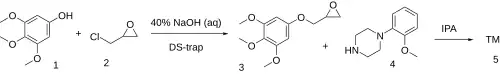 3,4,5-trimethoxyphenol (aka Antiarol) [642-71-7] (1) is alkylated with epichlorohydrin (2) to give [(3,4,5-Trimethoxyphenoxy)methyl]oxirane [74760-14-8] (3). Opening of the epoxide with o-anisyl-piperazine [35386-24-4] (4) completes the synthesis of enciprazine (5).