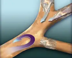 The one-way endobronchial valve is typically implanted such that on exhalation air is able to flow through the valve and out of the lung compartment that is fed by that airway, but on inhalation, the valve closes and blocks air from entering that lung compartment. Thus, an implanted endobronchial valve typically helps a lung compartment to empty itself of air. This has been shown to be beneficial in the treatment of emphysema, where lungs lose their elasticity and thus cannot contract sufficiently to exhale air, leading to air trapping and hyperinflation. When one or more diseased portions of an emphysematous lung are made to deflate and collapse, other healthier portions of the lung have more room in the chest cavity to inhale and exhale, pressure is removed from the diaphragm, and even the heart may function better as the hyperinflated lung becomes smaller.[1] The amount of residual volume reduction achieved, correlates with the effects on FEV1, quality of life and exercise capacity.[2] Endobronchial valves have also been shown to be beneficial in treatment of persistent air leaks in the lungs. Their use in the treatment of tuberculosis and its complications has been studied resulting in promising outcomes but further studies are needed.[3] Endobronchial valves may be the first successful medical device treatment of emphysema, a disease that affects millions of people worldwide and has no known cure, being managed traditionally by lung transplantation and/or lung volume reduction surgery (though some people do not meet the eligibility requirements for one or both of these invasive procedures).[4][5]