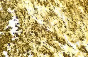 | Bartonella henselae bacilli in cardiac valve of a patient with blood culture-negative endocarditis. The bacilli appear as black granulations. | |
