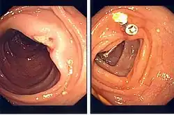 Endoclips have found a primary application in hemostasis (or the stopping of bleeding) during endoscopy of the upper (through gastroscopy) or lower (through colonoscopy) gastrointestinal tract.[3] Many bleeding lesions have been successfully clipped, including bleeding peptic ulcers,[6] Mallory-Weiss tears of the esophagus,[10] Dieulafoy's lesions,[11] stomach tumours,[12] and bleeding after removal of polyps.[13] Bleeding peptic ulcers require endoscopic treatment if they show evidence of high risk stigmata of re-bleeding, such as evidence of active bleeding or oozing on endoscopy or the presence of a visible blood vessel around the ulcer.[14][15] The alternatives to endoscopic clipping of peptic ulcers are thermal therapy (such as electrocautery to burn the vessel causing the bleeding), or injection of epinephrine to constrict the blood vessel. Comparative studies between endoclips and thermal therapy make the point that endoclips cause less trauma to the mucosa around the ulcer than electrocautery,[16] but no definitive advantage to either approach has reached consensus by gastroenterologists.[17][18]