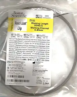 An endoclip, also referred to as a hemostatic clip or a hemoclip,[1][2] is a metallic mechanical device used in endoscopy in order to close two mucosal surfaces without the need for surgery and suturing. Its function is similar to a suture in gross surgical applications, as it is used to join together two disjointed surfaces, but, can be applied through the channel of an endoscope under direct visualization. Endoclips have found use in treating gastrointestinal bleeding (both in the upper and lower GI tract), in preventing bleeding after therapeutic procedures such as polypectomy, and in closing gastrointestinal perforations. Many forms of endoclips exist of different shapes and sizes, including two and three prong devices, which can be administered using single use and reloadable systems, and may or may not open and close to facilitate placement.