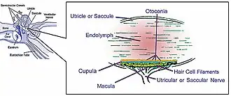 ![]() illustration of otolith organs showing detail of utricle, ococonia, endolymph, cupula, macula, hair cell filaments, and saccular nerve | |