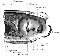 The duct opens directly to the outside environment in primitive galeaspids, all osteostracans, all placoderms, and most chondrichthyans, so there is no sac. In other vertebrates, the duct arises from the junction between the saccule and the utricle, and goes dorsomedially through a hole (foramen endolymphaticum) before terminating with a sac on the posterior surface of the temporal bone. The sacs in most vertebrates are small and contained within the braincase.[1][2]