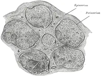The endoneurium (also called endoneurial channel, endoneurial sheath, endoneurial tube, or Henle's sheath) is a layer of delicate connective tissue around the myelin sheath of each myelinated nerve fiber in the peripheral nervous system.[1] Its component cells are called endoneurial cells.[2] The endoneuria with their enclosed nerve fibers are bundled into groups called nerve fascicles,[3] each fascicle within its own protective sheath called a perineurium.[3][4] If sufficiently large, nerves containing multiple fascicles, each with its blood supply and fatty tissue, may be bundled within yet another sheath, the epineurium.