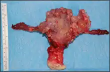 Endosalpingiosis is a condition in which fallopian tube-like epithelium is found outside the fallopian tube.[1] It tends to occur in females after menopause, and may be found on ovaries, uterus, peritoneum, bladder, or in retroperitoneal lymph nodes.[1]