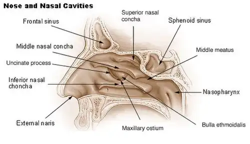 The transpterygoidal approach enters through the posterior edge of the maxillary sinus ostium and posterior wall of the maxillary sinus. This involves penetrating three separate sinus cavities: the ethmoid sinus, the sphenoidal sinus, and the maxillary sinus. Surgeons use this method to reach the cavernous sinus, lateral sphenoid sinus, infra temporal fossa, pterygoid fossa, and the petrous apex. Surgery includes a uncinectomy (removal of the osteomeatal complex), a medial maxillectomy (removal of maxilla), an ethmoidectomy (removal of ethmoid cells and/or ethmoid bone), a sphenoidectomy (removal of part of sphenoid), and removal of the maxillary sinus and the palatine bone. The posterior septum is also removed at the beginning to allow use of both nostrils.[2]